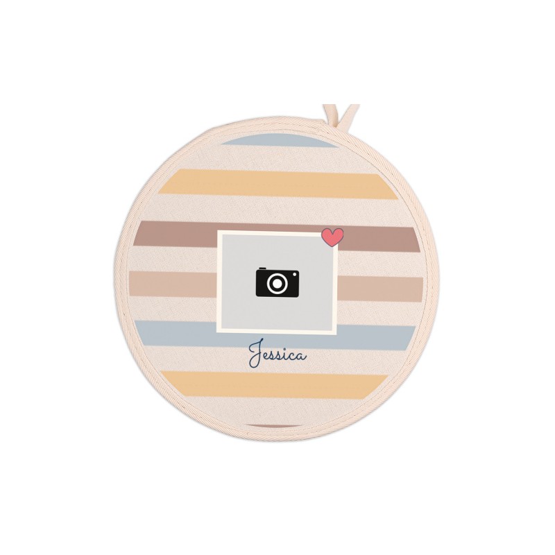Tabla de cortar de 15 x 15 cm, en madera natural y con asa troquelada.