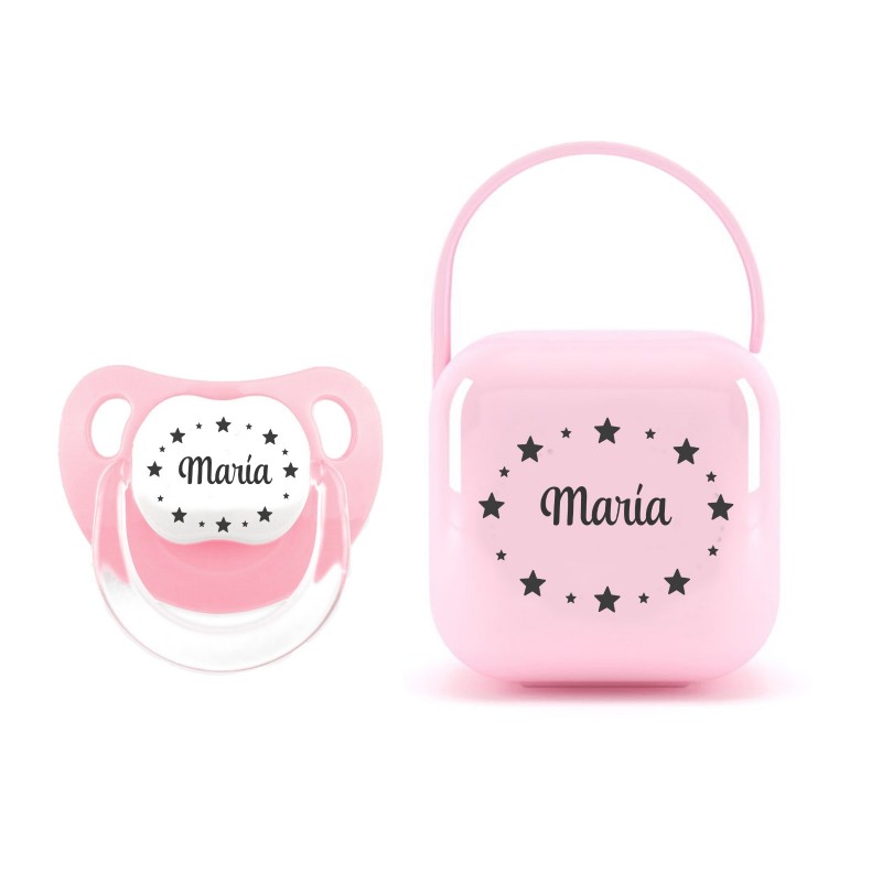 Pack compuesto de chupete y cajita portachupete. Disponible en tono rosa, azul, blanca, menta y gris.