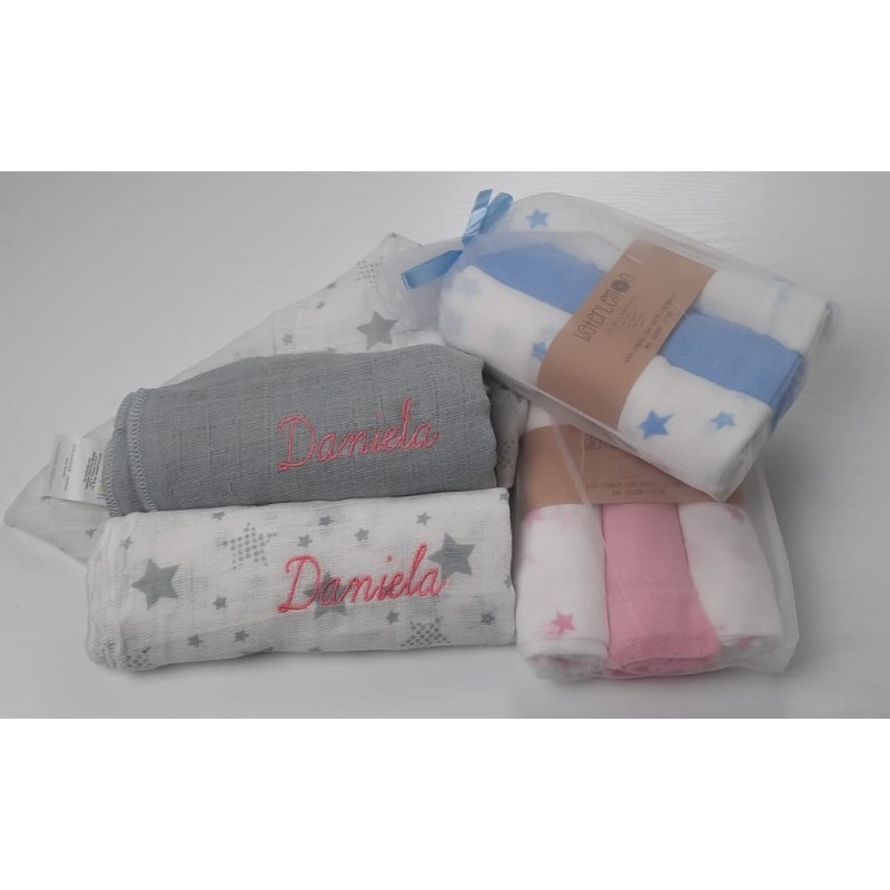 Pack de tres gasas blancas con diferentes estampados, textura vaporosa, suave y transpirable.