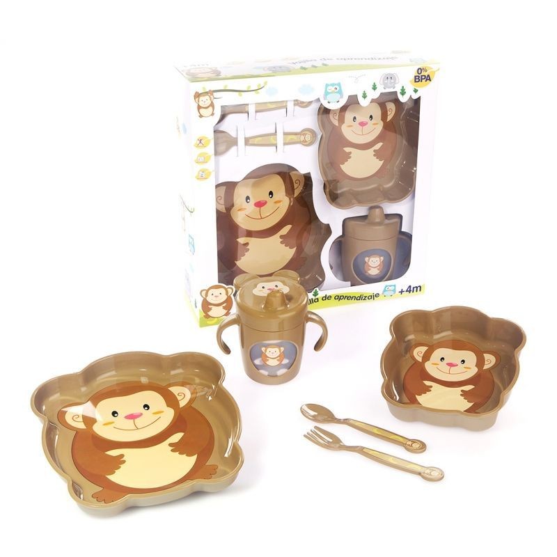 La vajilla de aprendizaje está fabricada con material irrompible y apto para el microondas. La taza tiene dos asas que permiten al niño manejarla con facilidad, la taza de aprendizaje se puede utilizar para líquidos de distintas texturas y densidades, desde zumos hasta leche o agua.